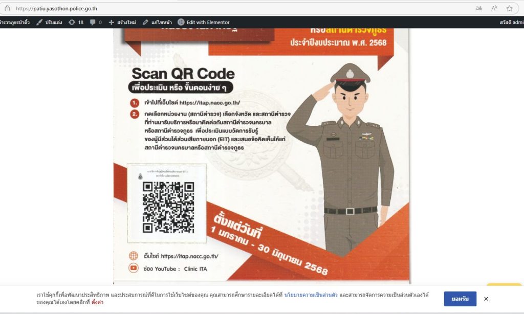 สถานีตำรวจภูธรป่าติ้ว จังหวัดยโสธร จัดทำป้ายประชาสัมพันธ์และเชิญชวนผู้มารับบริการ/มาติดต่อ สถานีตำรวจ ร่วมจัดทำแบบการรับรู้ของผู้มีส่วนได้เสียภายนอก (Enternal Integrity Transparency Assesment : EIT) 2025 สำหรับนำไปพัฒนาปรับปรุงการให้บริการของสถานีตำรวจ โดยการสแกน QR Code ซึ่งได้ประชาสัมพันธ์ไว้ที่หน้าเว็บไซต์หลักของ สภ.